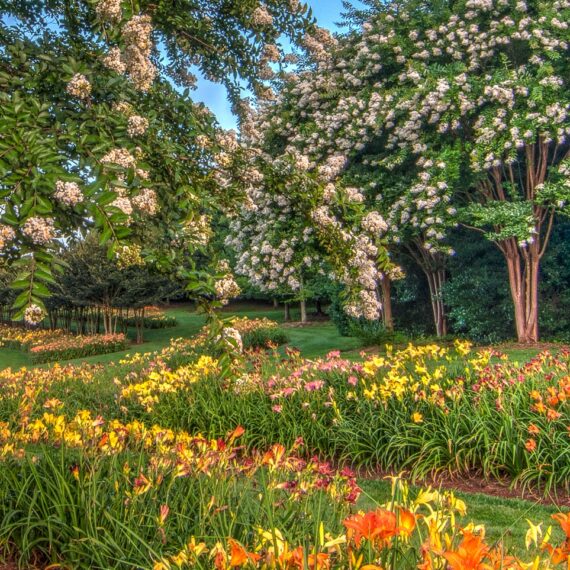Long curved walks were constructed and one was planted with an allée of 70 red crape myrtle trees providing plenty of summer shade.