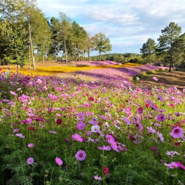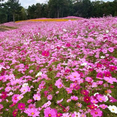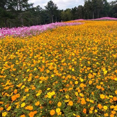 Millions of Cosmos sulphureus (common name Sulphur Cosmos) in orange and yellow and Cosmos bipinnatus (common name Garden Cosmos) in burgundy, white, pink & violet cover the meadow in waves of brilliant color.
