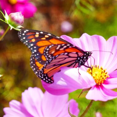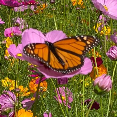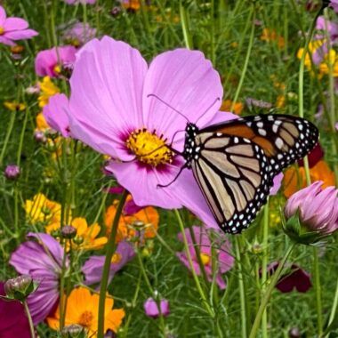 As a member of the daisy family, cosmos flowers are appealing to Monarch butterflies because of their abundant flowers and rich nectar stores.