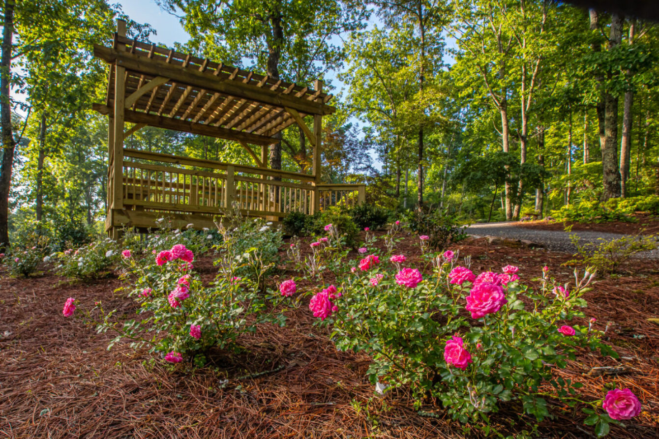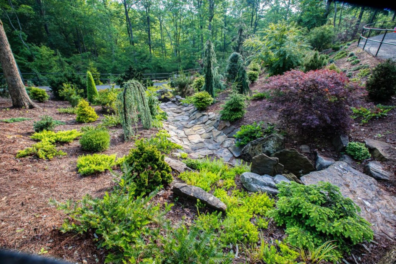 The Inspiration Garden today is a treasure, bejeweled with beautiful flowering plants: more than 1500 evergreen Encore azaleas in all 33 varieties, 1200 native azaleas of over 100 varieties. Gibbs added a collection of rare and unusual dwarf Japanese maples, a dwarf ginkgo collection and 200 varieties of dwarf conifers. Then, to add spring, summer and fall color, he planted the Drift Rose series—all dwarf and low maintenance—plus the Knockout Rose series. At key high points he added viewing decks with arbors where visitors can enjoy the broad views of the Inspiration Garden as it gracefully unfurls its beauty and colors across the hillside, down to the valley. The viewing platforms are a great place to take photos—or notes filled with ideas for home gardens.