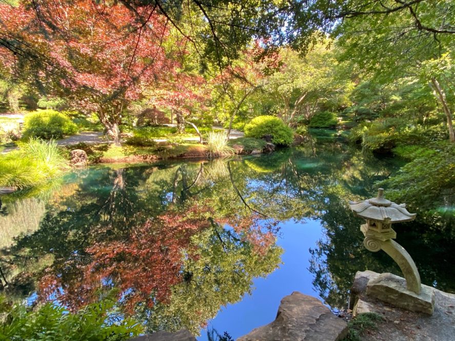 The Japanese Hill and Pond Stroll garden, “Tsukiyama,” is over 40 acres and the largest Japanese Garden in the nation. Entered through a Torii Gate, a meandering walk descends subtly around seven spring-fed ponds with islands, bridges, massive boulders and rocks. Connecting an island to the shore with a natural stone bridge created the “Bridge to Heaven.”