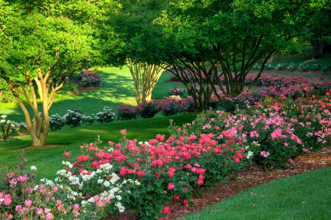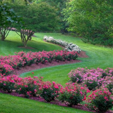 Knockout roses are planted in long curved beds, flanked with lush green lawn, above the water gardens and other areas.