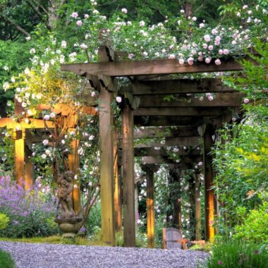 Fragrant, climbing “New Dawn” blush pink roses are featured on a long serpentine wooden arbor and continually petal the walks.