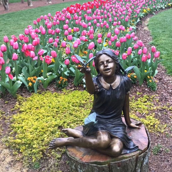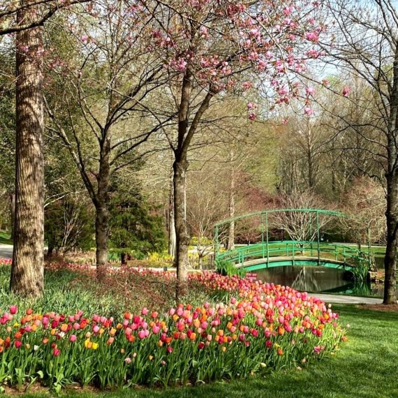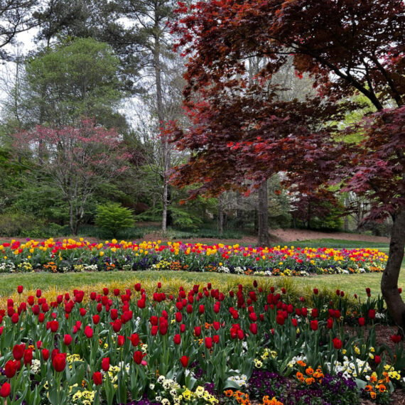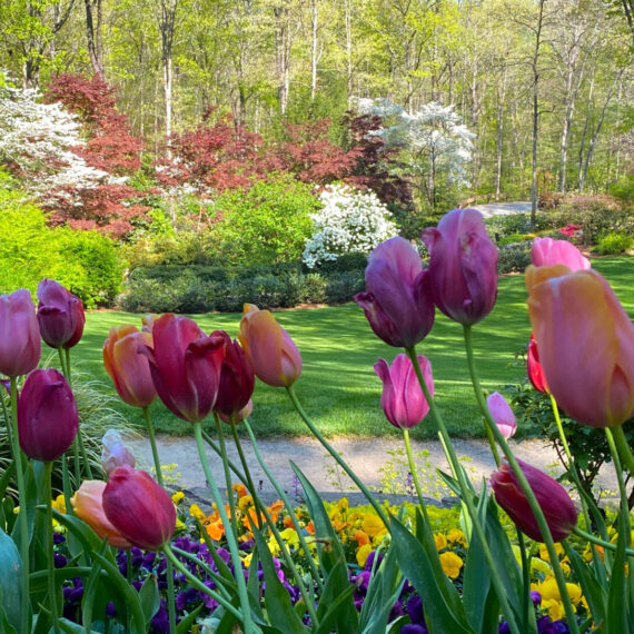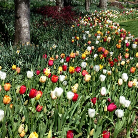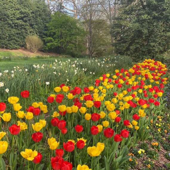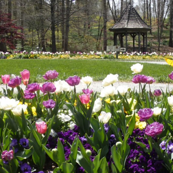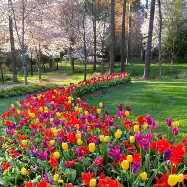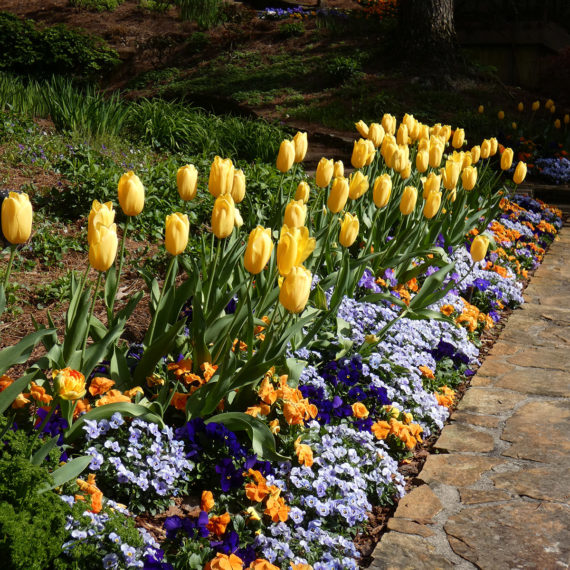 Every December we plant over 30,000+ tulip bulbs. In the spring serpentine beds throughout the Gardens come alive with the striking colors of 40 different types of early, mid and late blooming tulips.