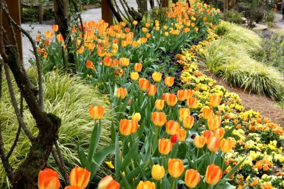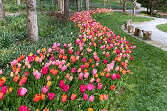 Serpentine beds of Tulips can be seen throughout the Gardens.